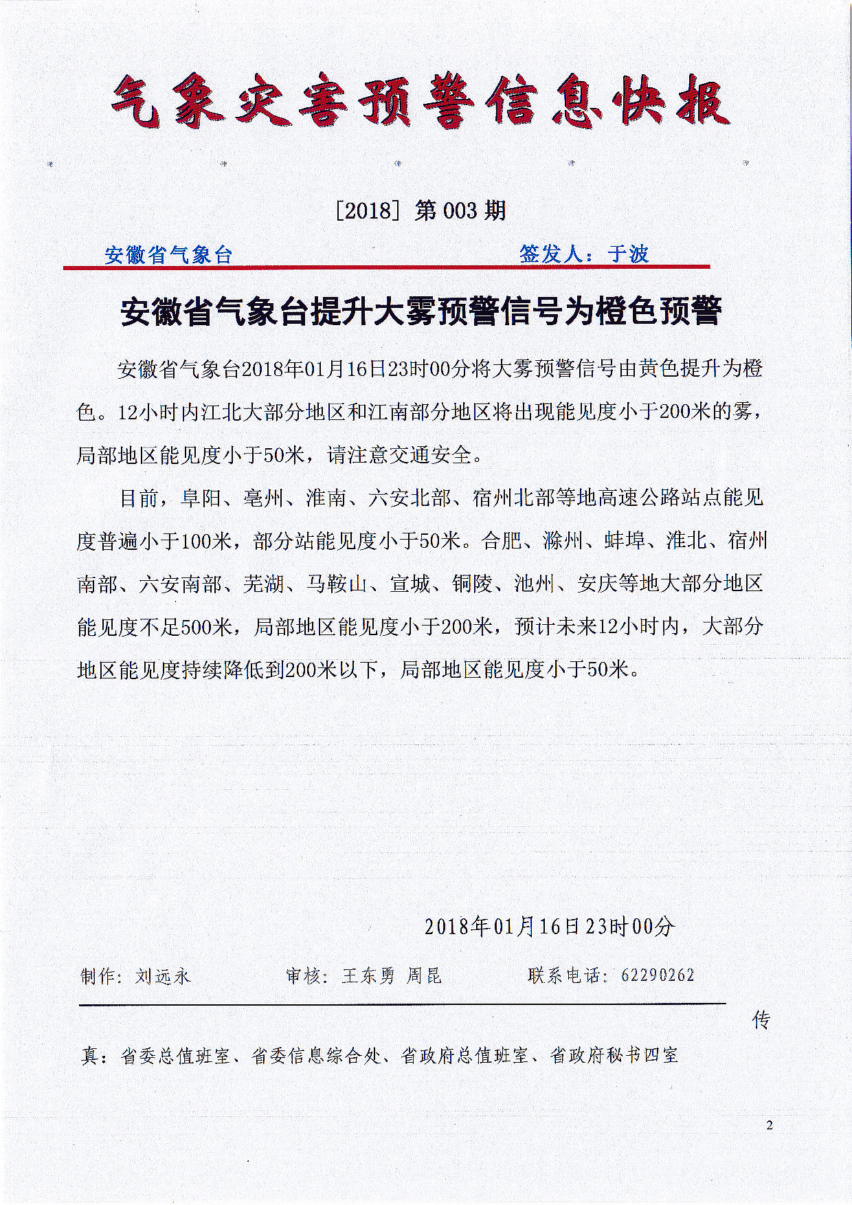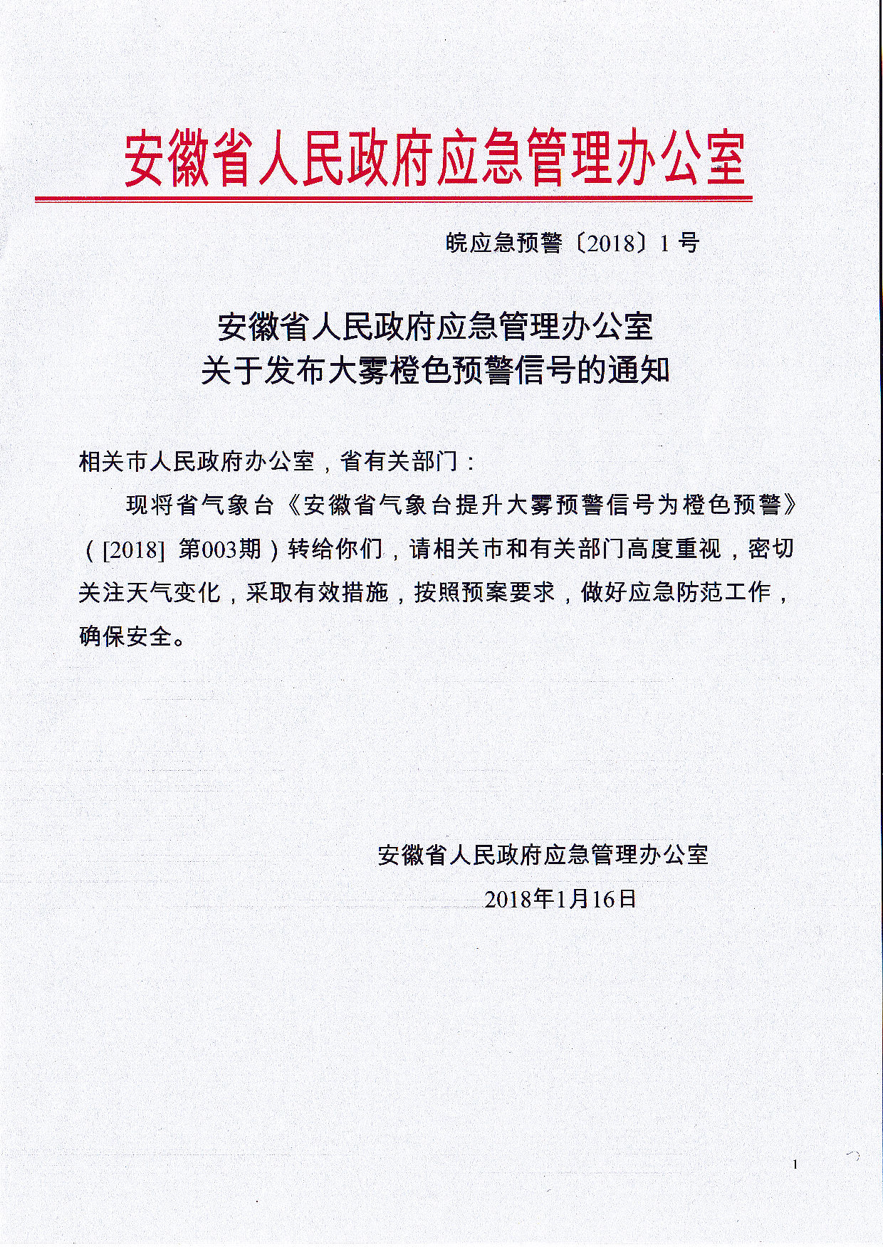 安徽省人民政府应急管理办公室关于发布大雾橙色预警信号的通知